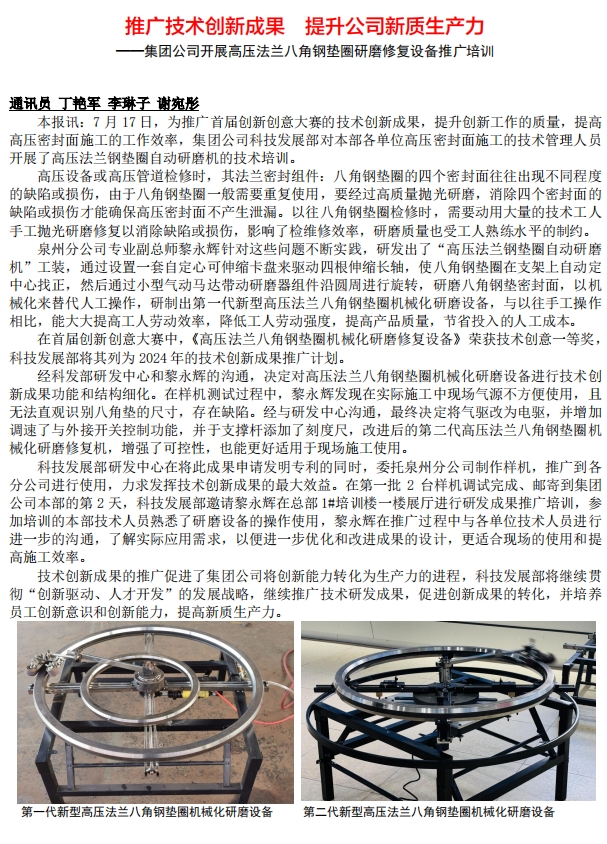 推廣技術(shù)創(chuàng)新成果 提升公司新質(zhì)生產(chǎn)力 ——集團(tuán)公司開(kāi)展高壓法蘭八角鋼墊圈研磨修