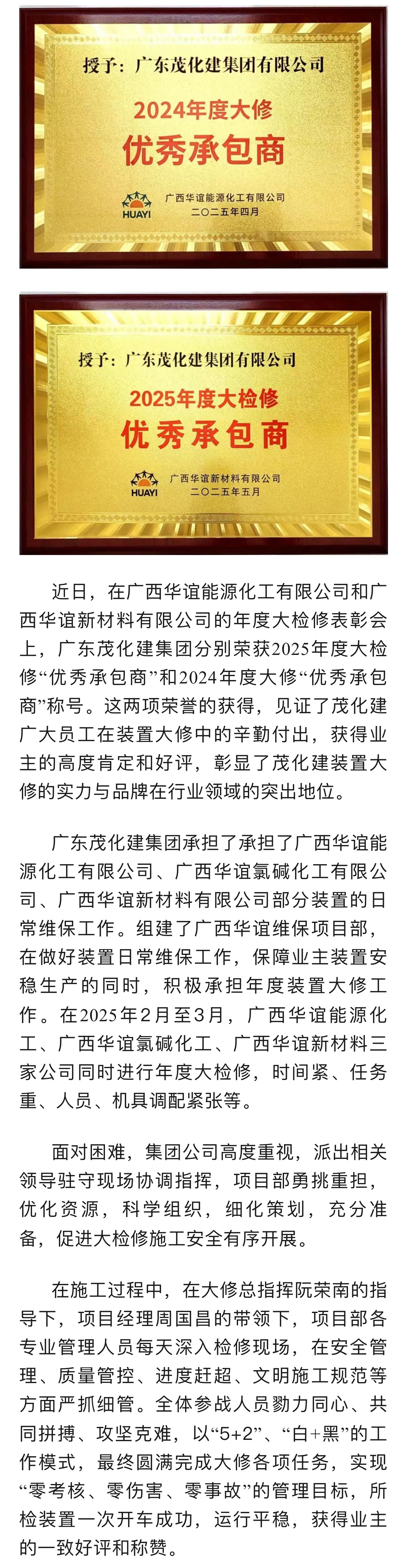 雙喜臨門|茂化建榮獲廣西華誼能源化工、新材料大修優(yōu)秀承包商稱號