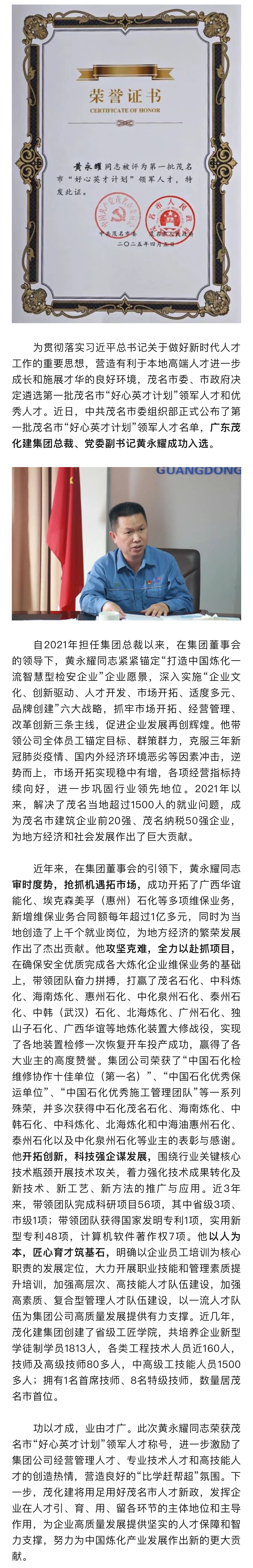 祝賀!廣東茂化建集團黃永耀同志被評為第一批茂名市“好心英才計劃”領(lǐng)軍人才