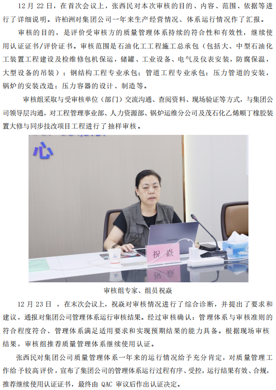集團公司通過質(zhì)量管理體系年度監(jiān)督審核